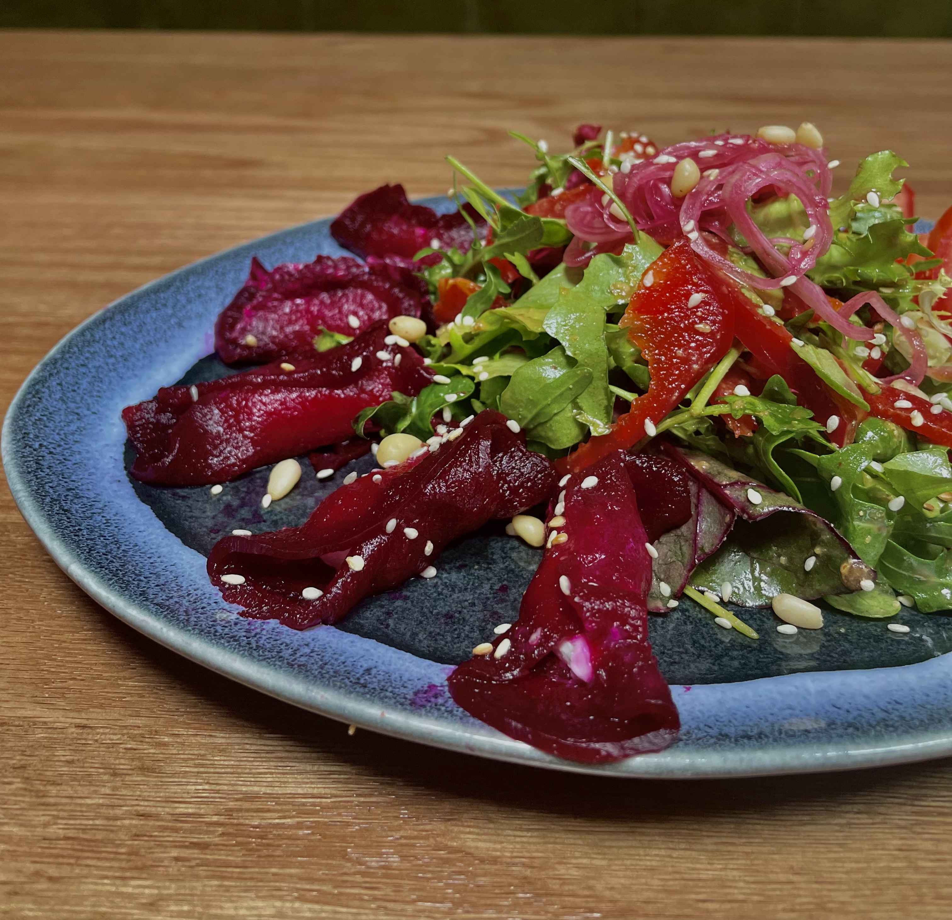 листя салату, буряк, помідор чері, перець болгарський, крем сир, кедрові горішки