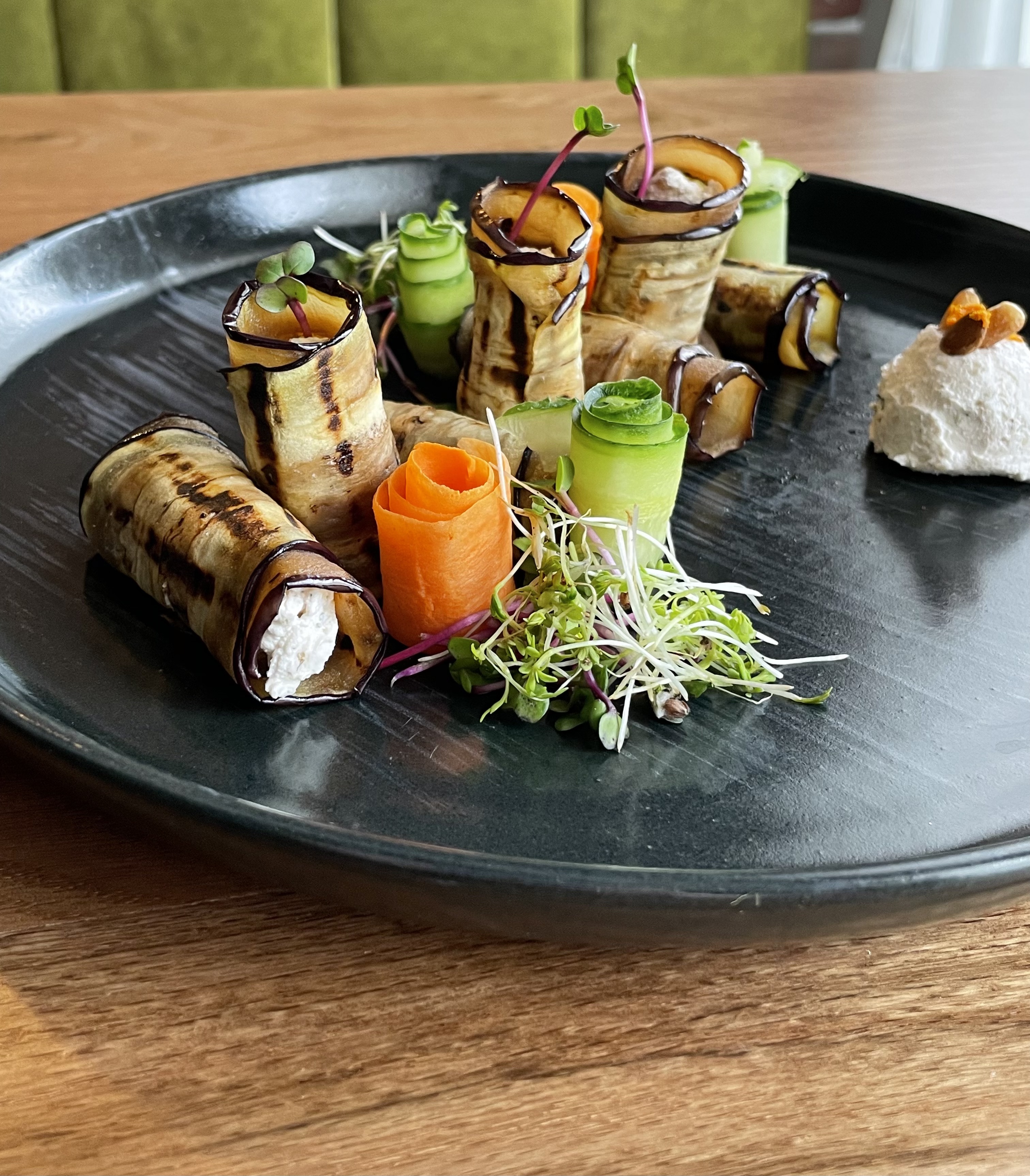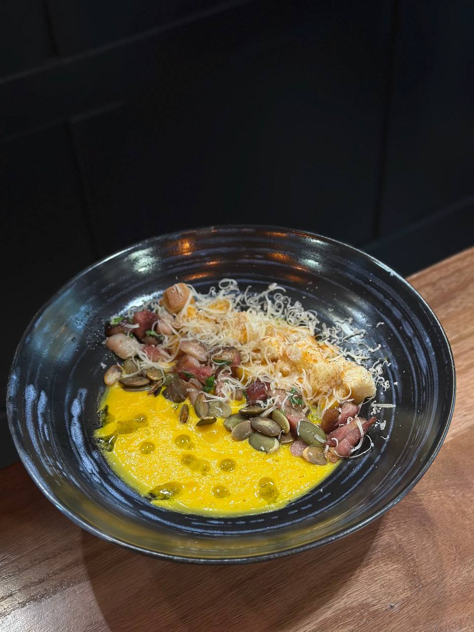 з сиром брі, грінками, виноградом, мигдалевими пластівцями та манговим соусом